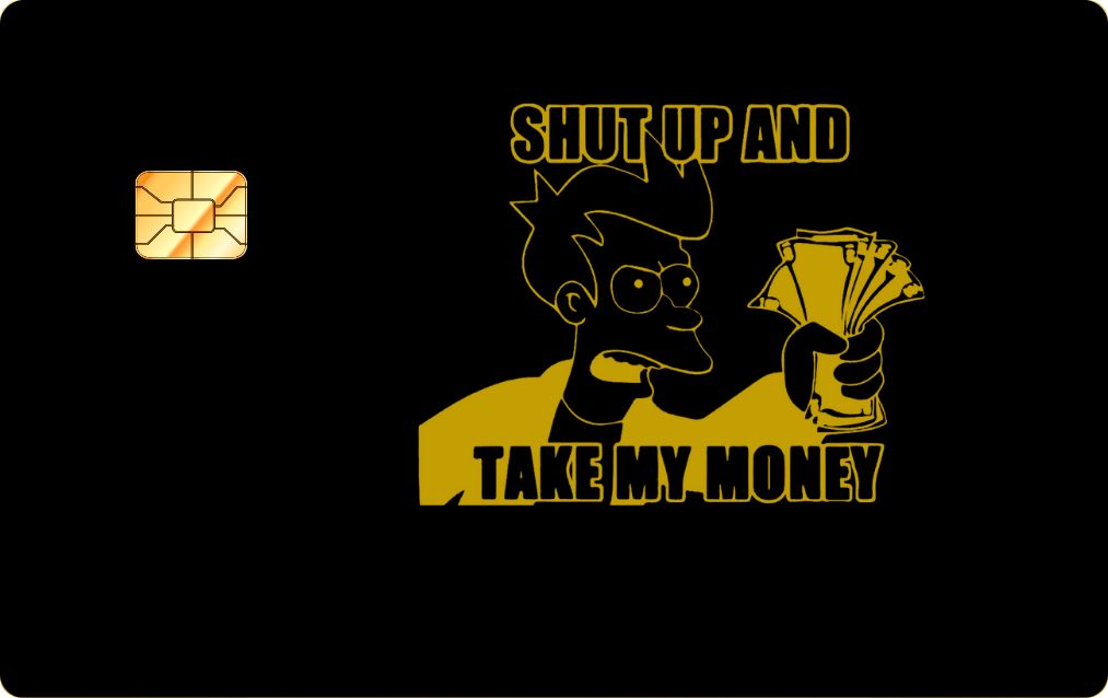 You don’t just spend money — you throw it like a boss. The Black “Shut Up and Take My Money” Metal Card brings meme culture to life with a bold gold engraving of everyone’s favorite impulsive spender. This card is loud, proud, and absolutely unforgettable.